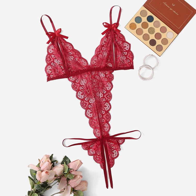 Ekskluzywne koronkowe body otwarte krocze Walentynki Święta ciemny czerwony
