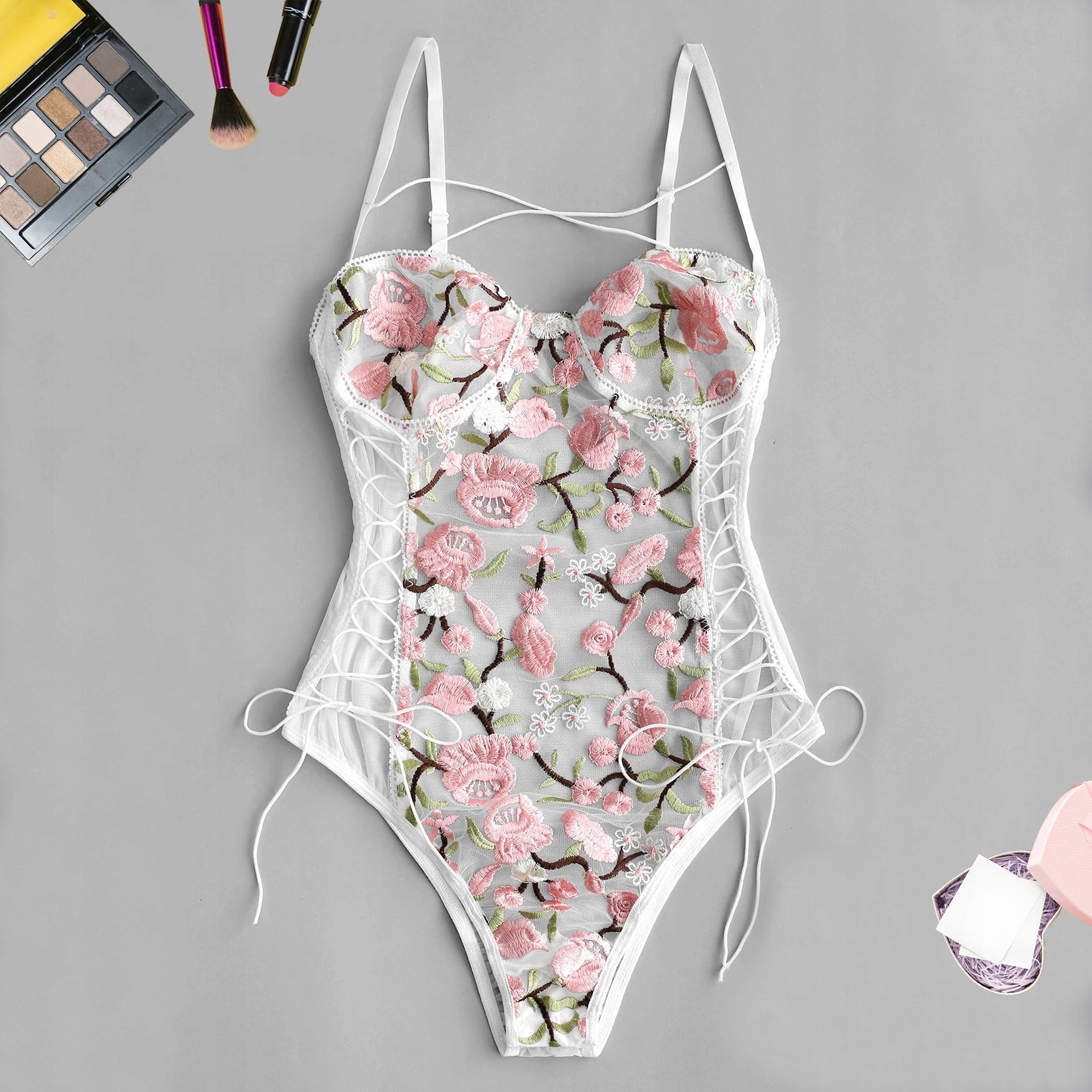 Seksowne jedno-częściowe body ze sznurowaną regulacją na bokach z pięknym motywem kwiatów dostępne w dwóch kolorach. Body wykonane w klasycznej wersji majtek. Całość w prześwitującym białym materiale.
