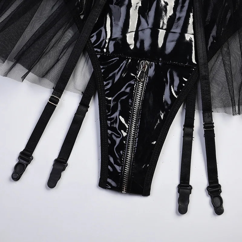 Strój w połączeniu skóry PU, siatki i tiulu doda seksapilu każdej noszącej je kobiecie i pomoże rozpalić każdego mężczyznę do czerwoności…