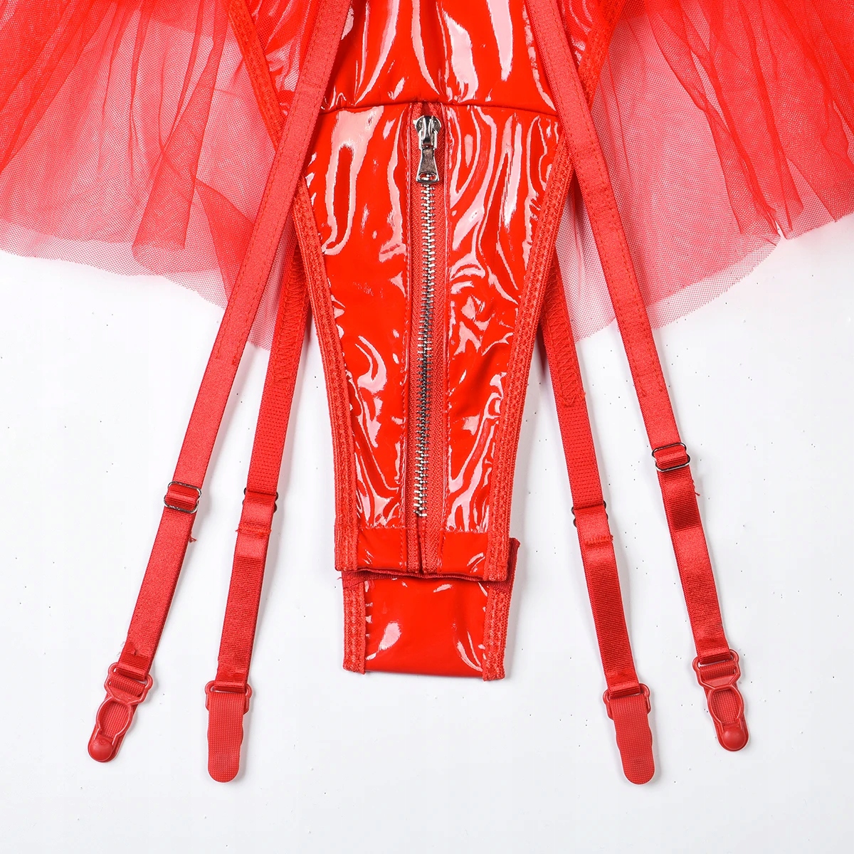Strój w połączeniu skóry PU, siatki i tiulu doda seksapilu każdej noszącej je kobiecie i pomoże rozpalić każdego mężczyznę do czerwoności…