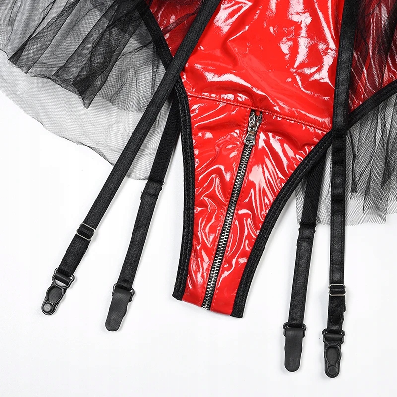 Strój w połączeniu skóry PU, siatki i tiulu doda seksapilu każdej noszącej je kobiecie i pomoże rozpalić każdego mężczyznę do czerwoności…