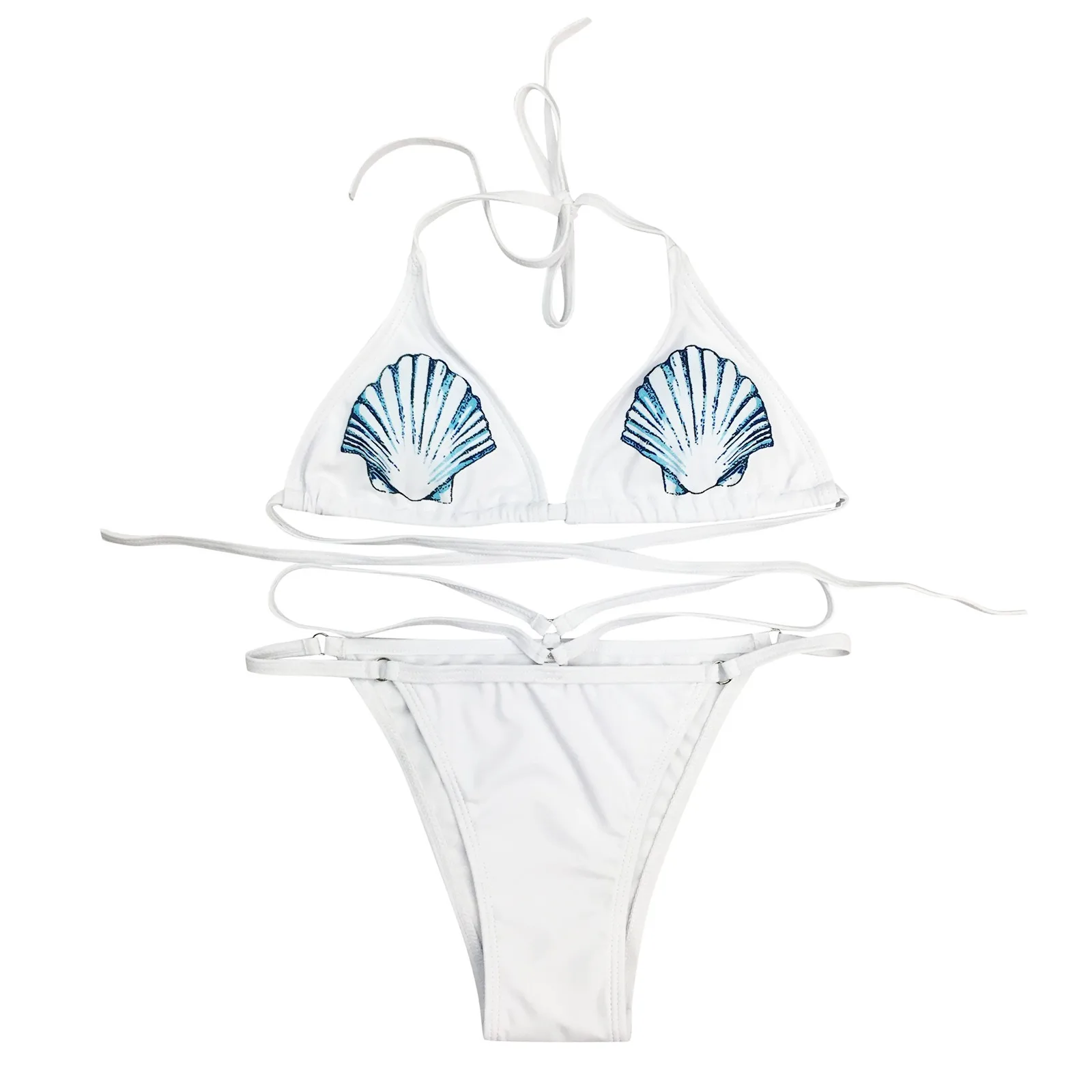 To białe bikini z nadrukiem muszelek na biustonoszu wiązane jest na szyi i na plecach. Biustonosz typu push-up i figi z paseczkami prezentują się bardzo elegancko.