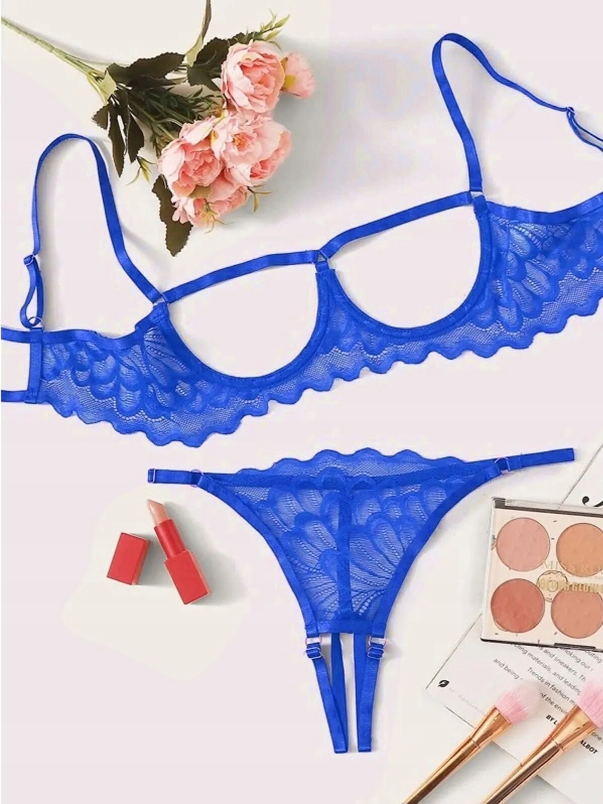 Koronkowy komplet bielizna stringi + stanik otwarty biust krocze niebieski