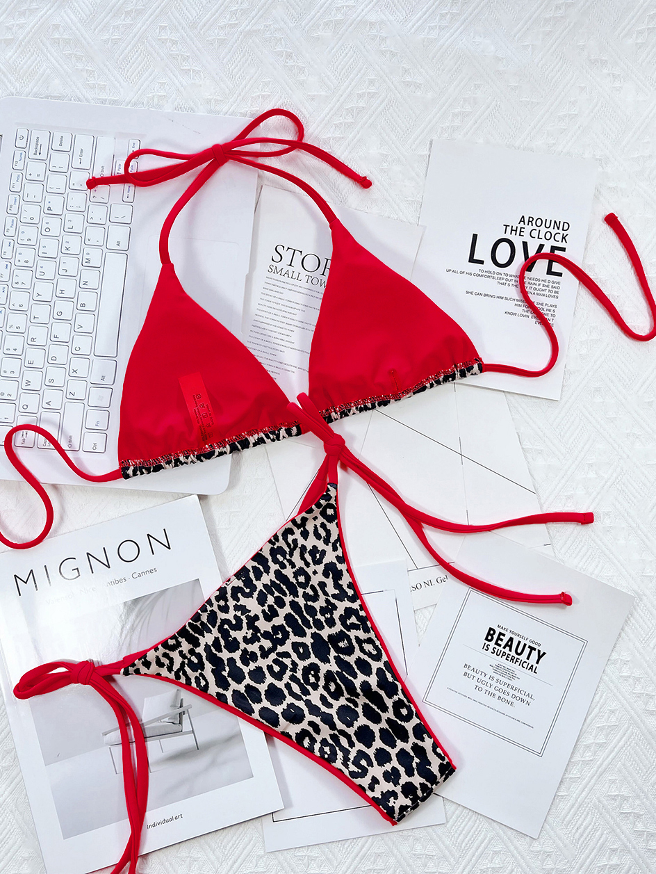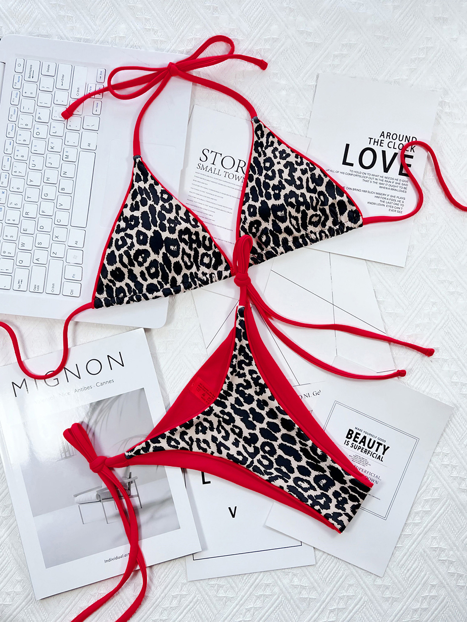 Kos bikini wiązane na plażę strój kąpielowy panterka czerwona obwódka