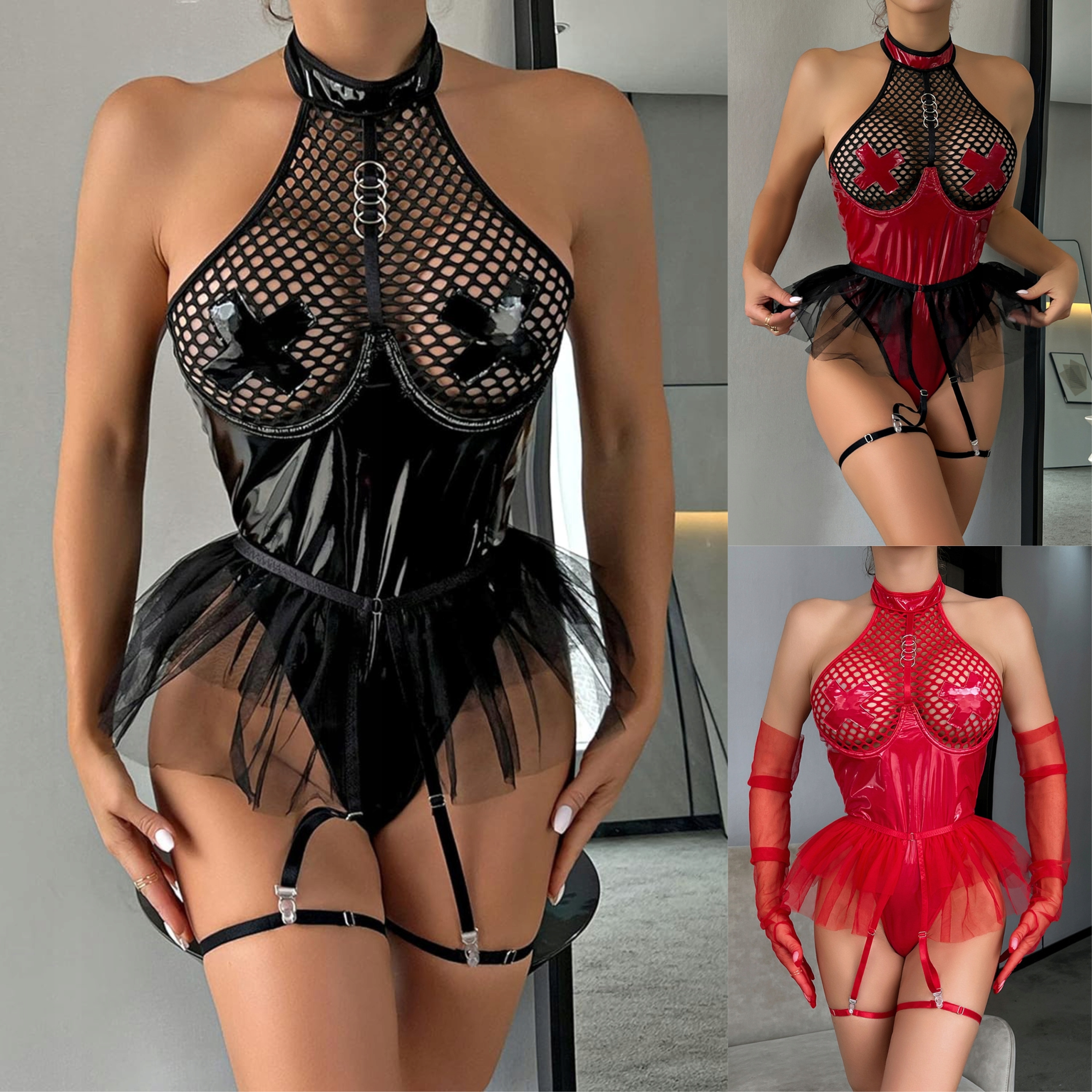 Strój w połączeniu spandexu, który ma imitować skórę, siatki oraz tiulu doda seksapilu każdej noszącej je kobiecie i pomoże rozpalić każdego mężczyznę do czerwoności…