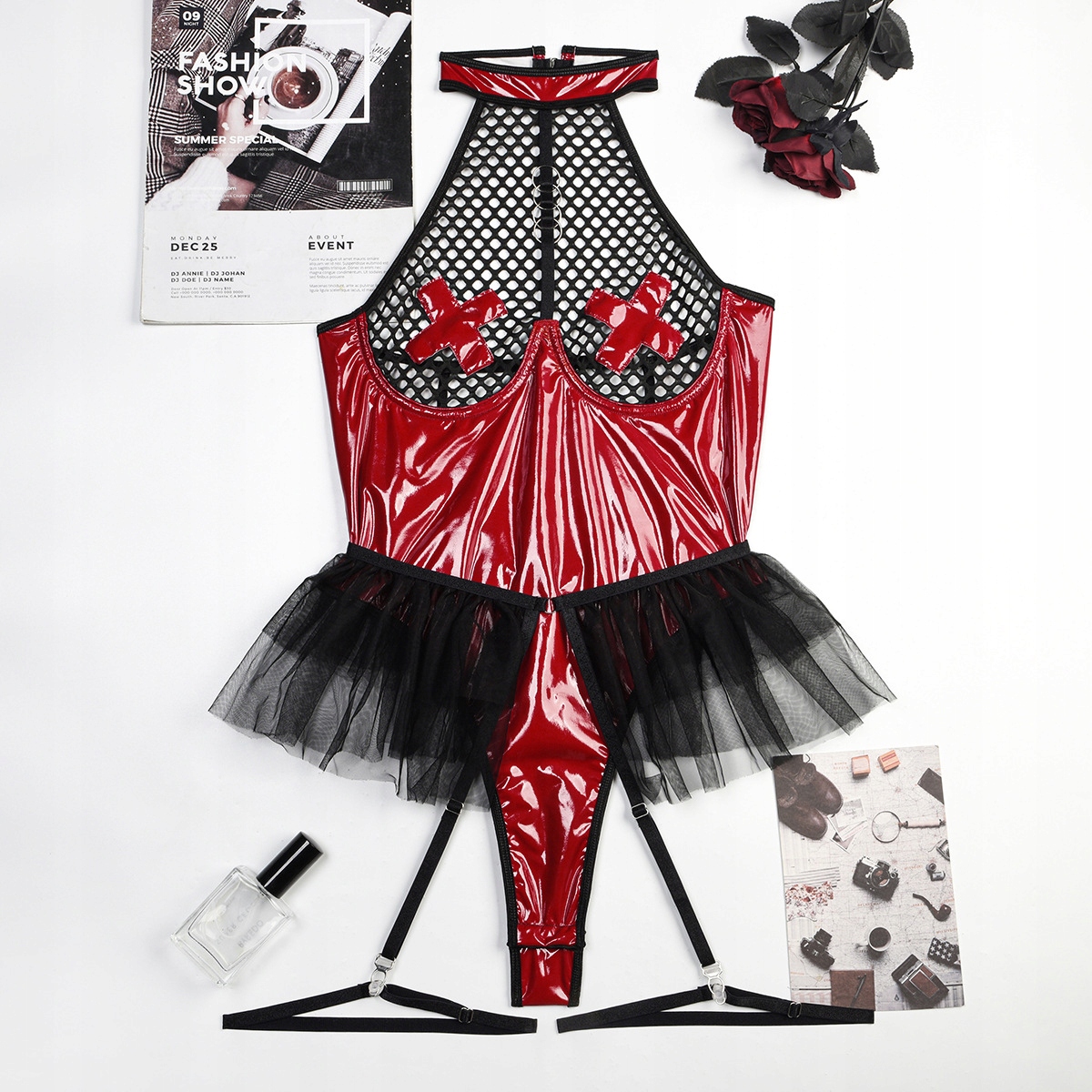 Body posiada rozpinane kroczę co na pewno ułatwi dostęp do łechtaczki. Na wysokości sutków wszyte są krzyżyki mające imitować nasutniki, a do dołączonej tuniki z paskami można dopiąć paski z zestawu lub zamienić je na pończochy (dostępne na oddzielnej aukcji), które dodatkowo wzbogacą kostium.