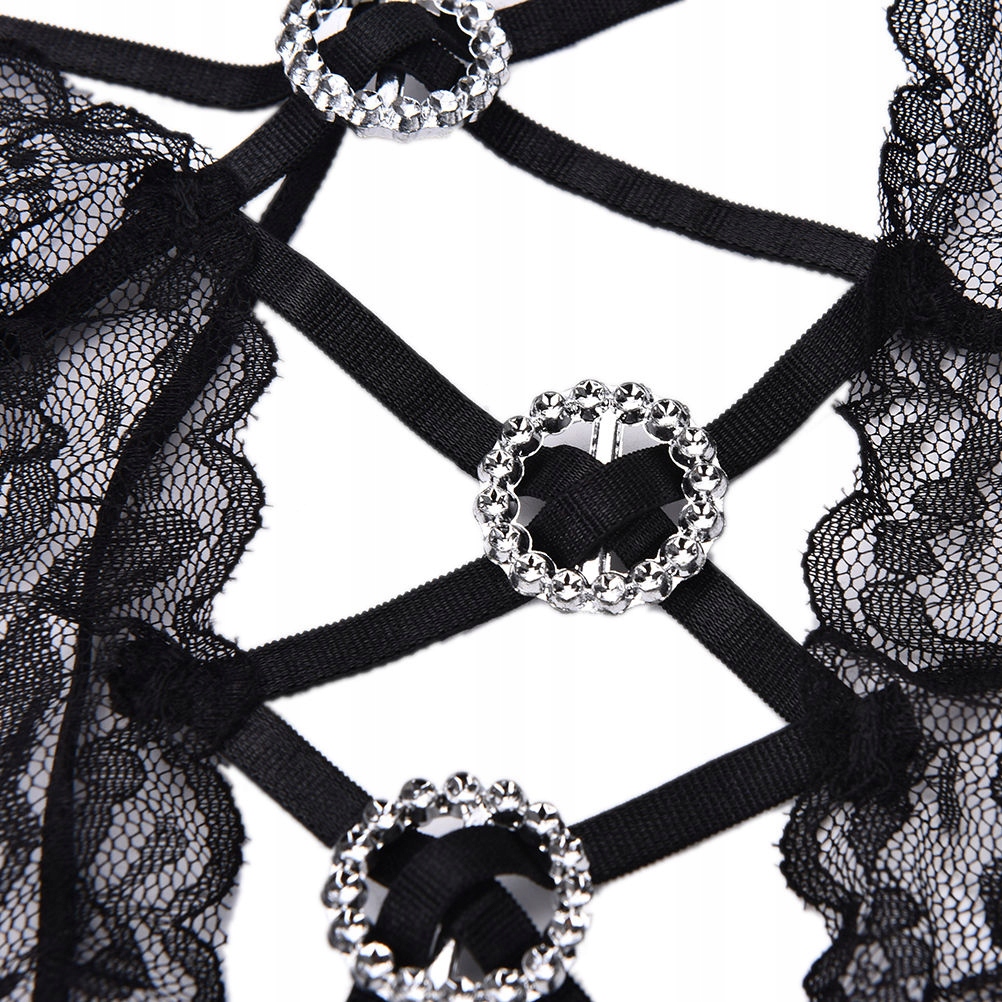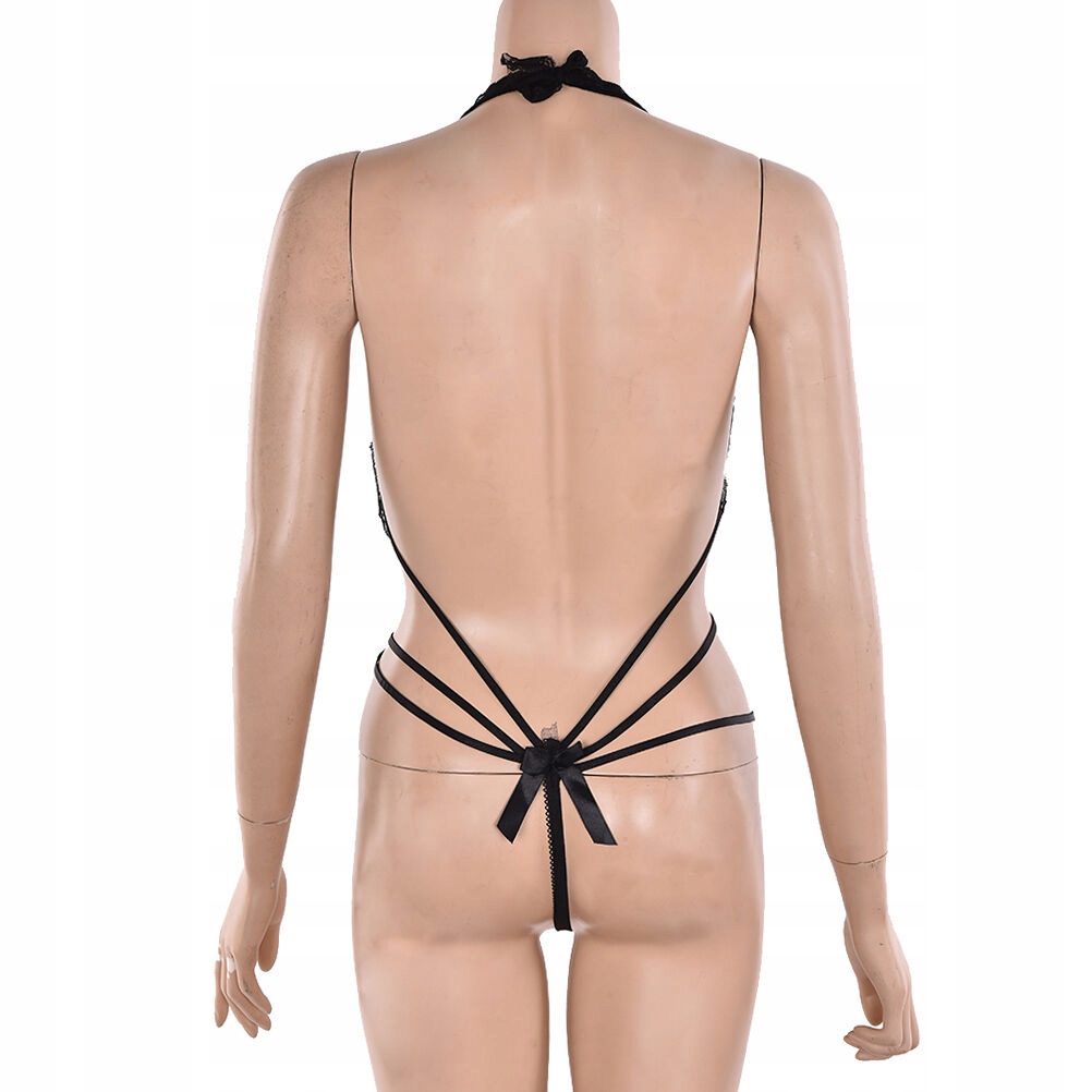 Seksowne jedno-częściowe prześwitujące body oplatane czarną wstążką ze świecącymi koralikami.