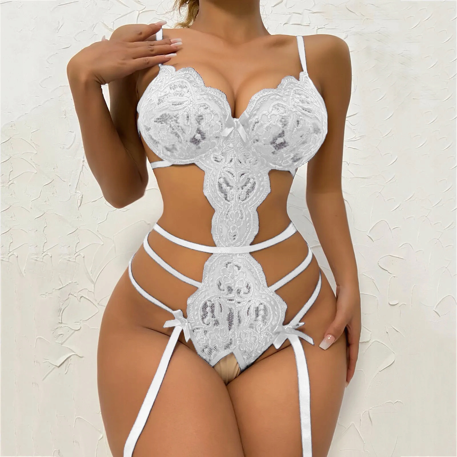 Seksowne koronkowe body na paski otwarte krocze Walentynki biały