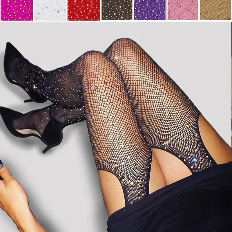 Seksowne rajstopy siatkowe z dziurami otwarty krok z cyrkonią czarny