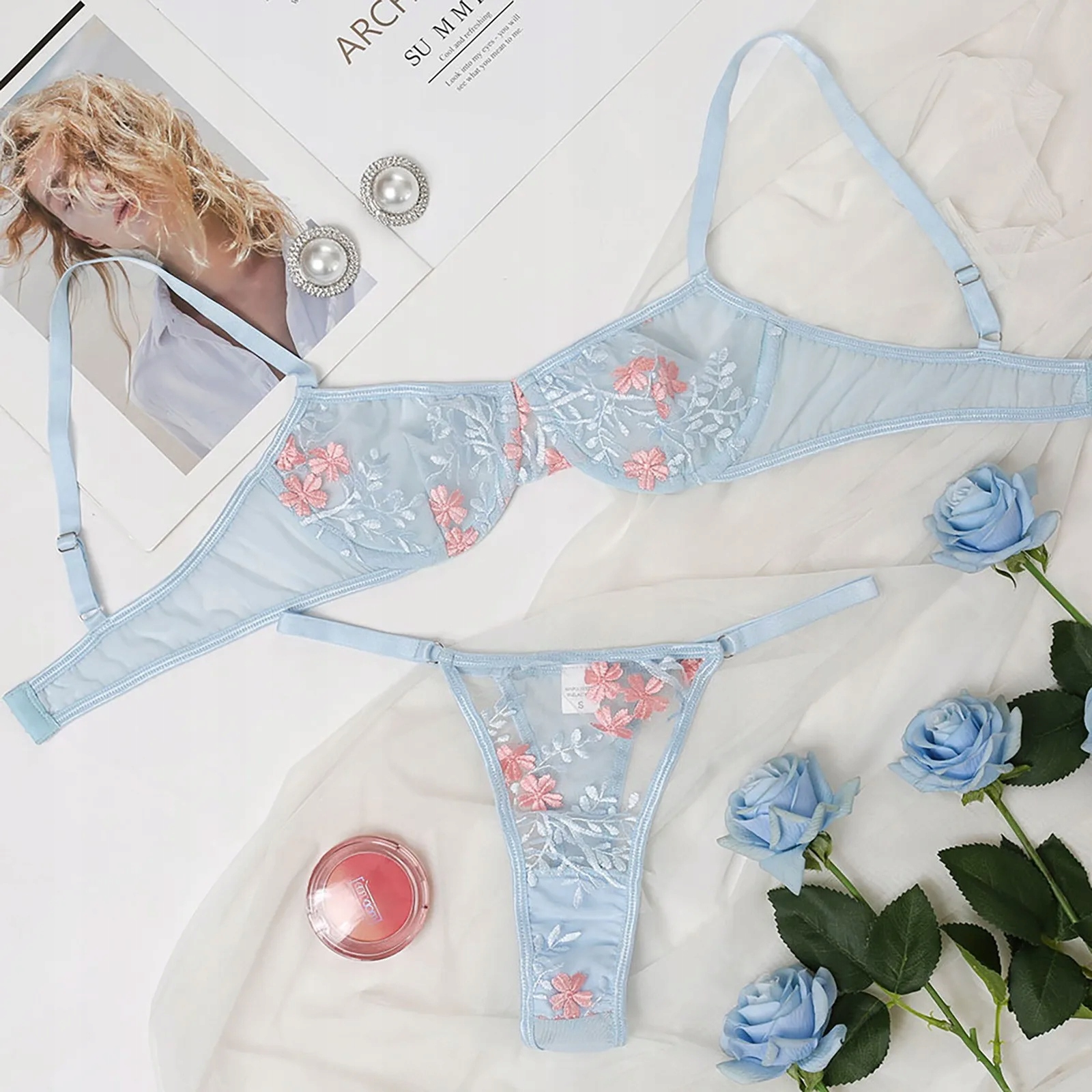 Ten seksowny komplet wykonany został w delikatnym błękitnym materiale. Cały wzór posiada haftowane zdobienia kwiatami. Biustonosz z fiszbinami.