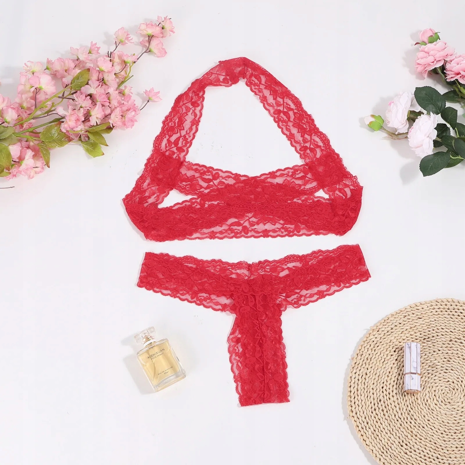 Seksowny komplet bielizna z koronki otwarty biust Walentynki czerwony S