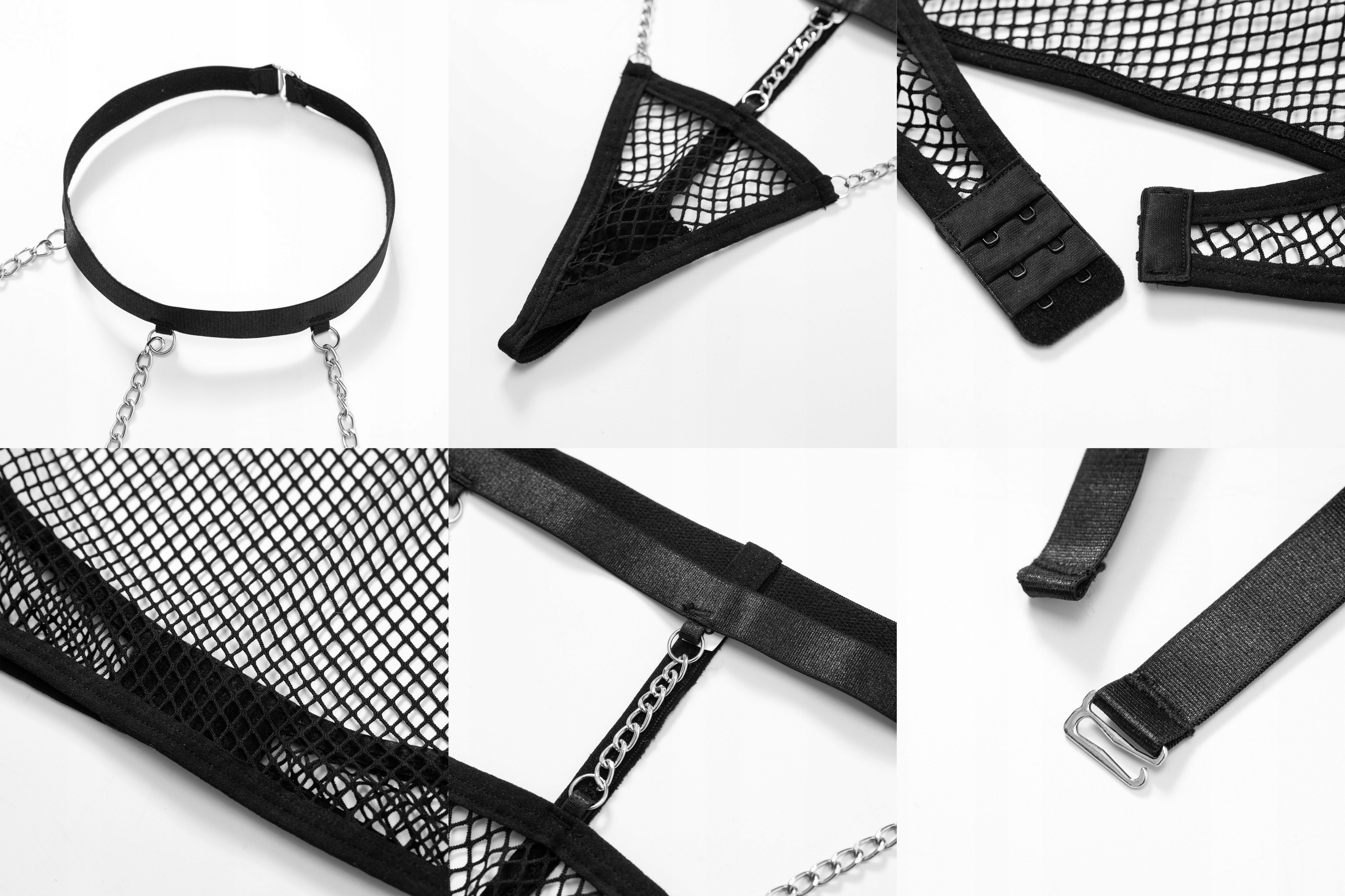 Ten seksowny komplet wykonany został z jeszcze seksowniejszej grubej siatki i metalowego łańcuszka co w połączeniu tworzy świetne zestawienie seksapilu i elegancji. Górna część kompletu zapinana jest na haftkę zarówno na plecach jak i na szyi.